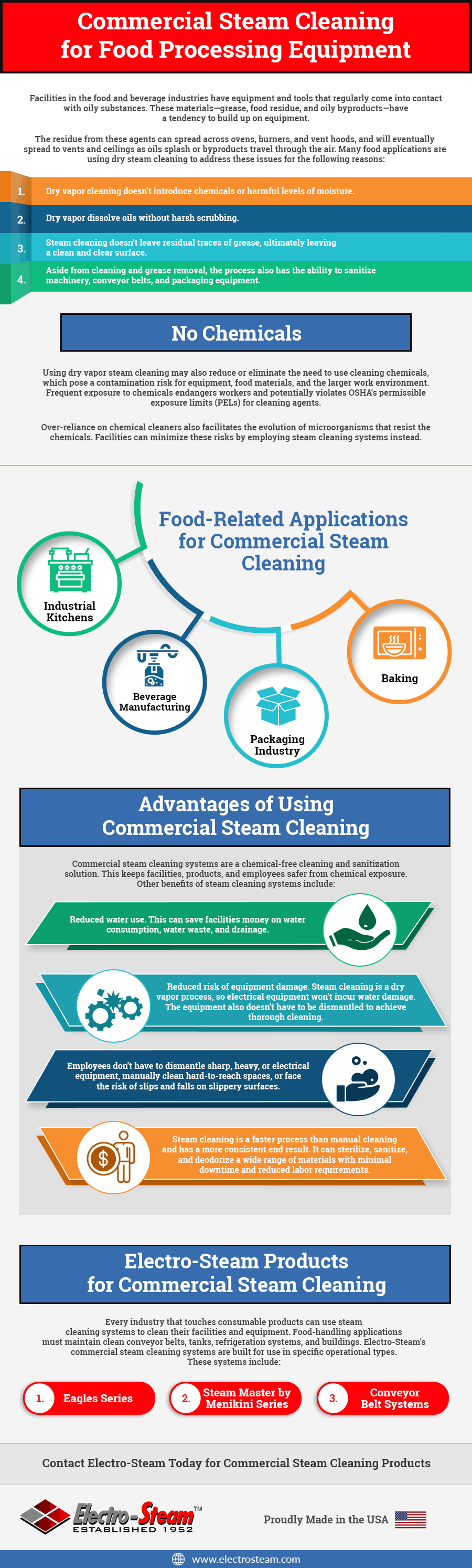 Every industry that touches consumable products can use steam cleaning systems to clean their facilities and equipment. Food-handling applications must maintain clean conveyor belts, tanks, refrigeration systems, and buildings. Electro-Steam’s commercial steam cleaning systems are built for use in specific operational types. These systems include: